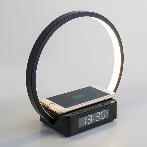 Настольный светодиодный светильник с беспроводной зарядкой и будильником 80505/1 черный