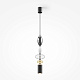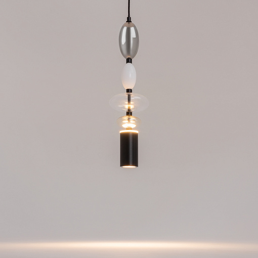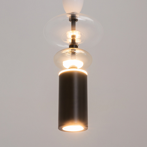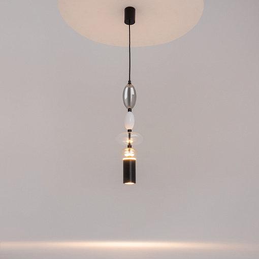 Черная металлическая арматура. Плафоны из стекла коньячного, белого, дымчатого цвета и прозрачный. Источник света комбинированный: нижний - съемная лампа с цоколем GU10, верхний -  встроенный LED. Цветовая температура светильников 2700К, угол рассеивания света 120 градусов. Высота регулируется с помощью провода длиной 3 м.  Монохромный дизайн, стеклянные элементы впишутся в различные стили интерьеров.