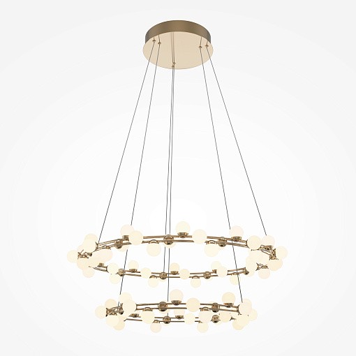 Арматура из металла в золотом цвете. Плафоны-сферы — белый пластик. Дизайн с имитацией молекулярной структуры. LED-источники света.
