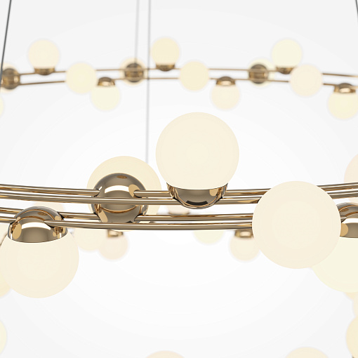 Арматура из металла в золотом цвете. Плафоны-сферы — белый пластик. Дизайн с имитацией молекулярной...подробнее