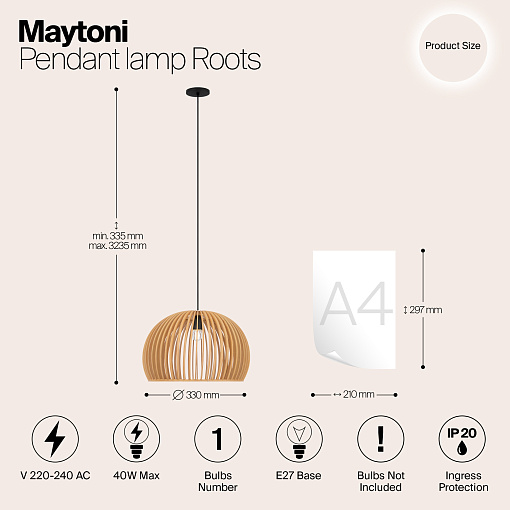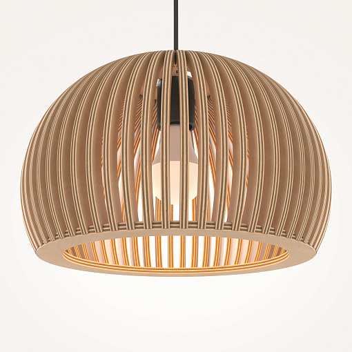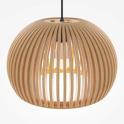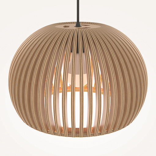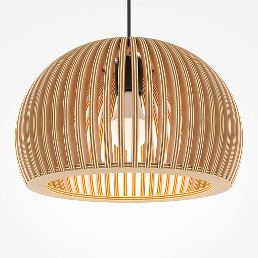 Материал арматуры – металл, цвет – черный.    Абажур – 5-ти  слойная фанера бежевого оттенка, покрытая специальным ла-  ком. Тканевый черный провод. Регулируемая высота. Простые  лаконичные форма, природные материалы. Цоколь E27.
