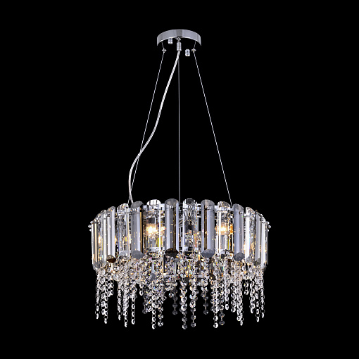 Арматура из металла, цвет – хром. Прозрачный хрустальный декор двух видов: крупный вытянутый по внешнему периметру и округлый на подвесках. Высота подвесных моделей регулируется. Цоколь Е14.