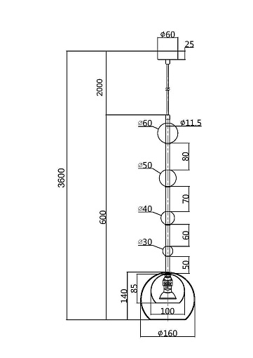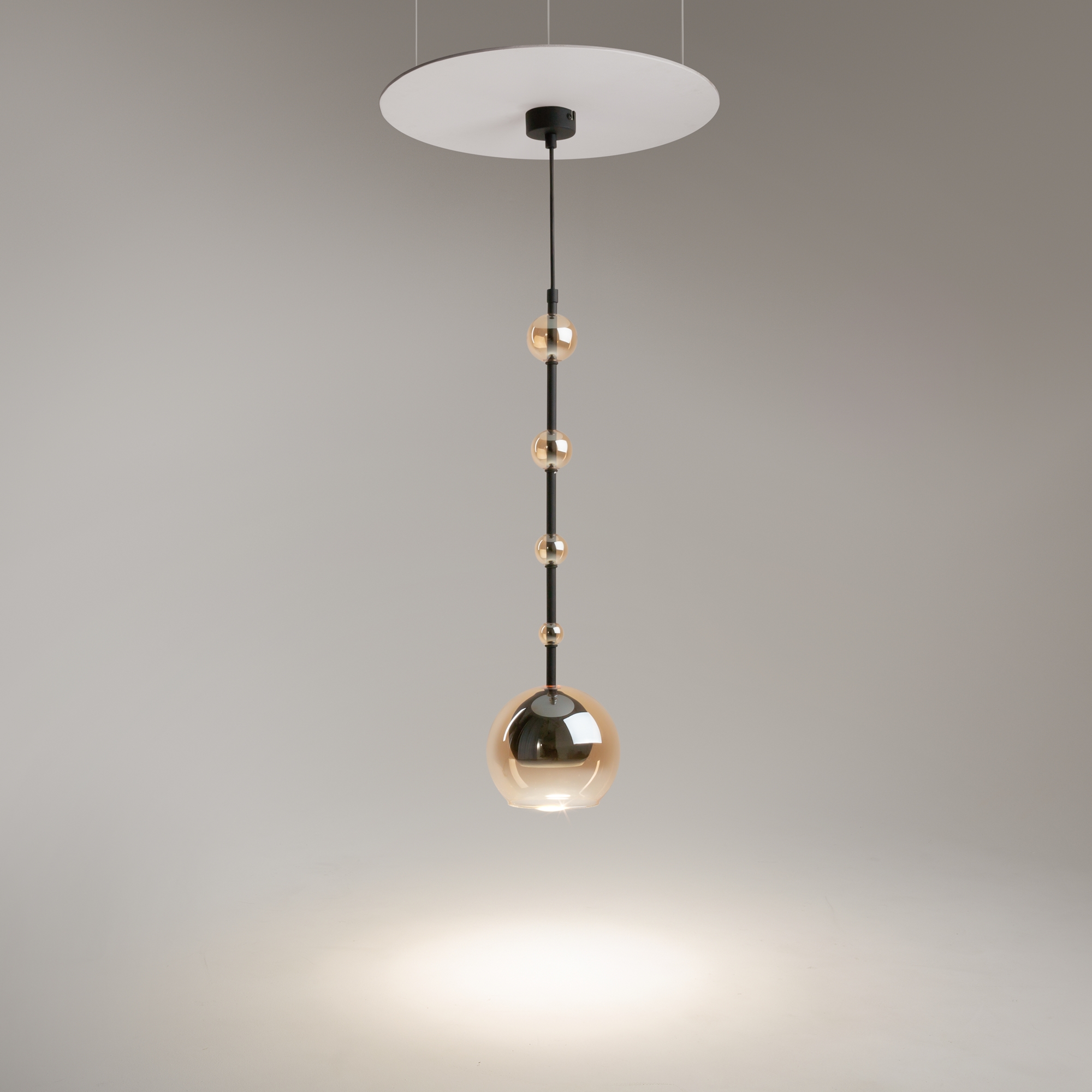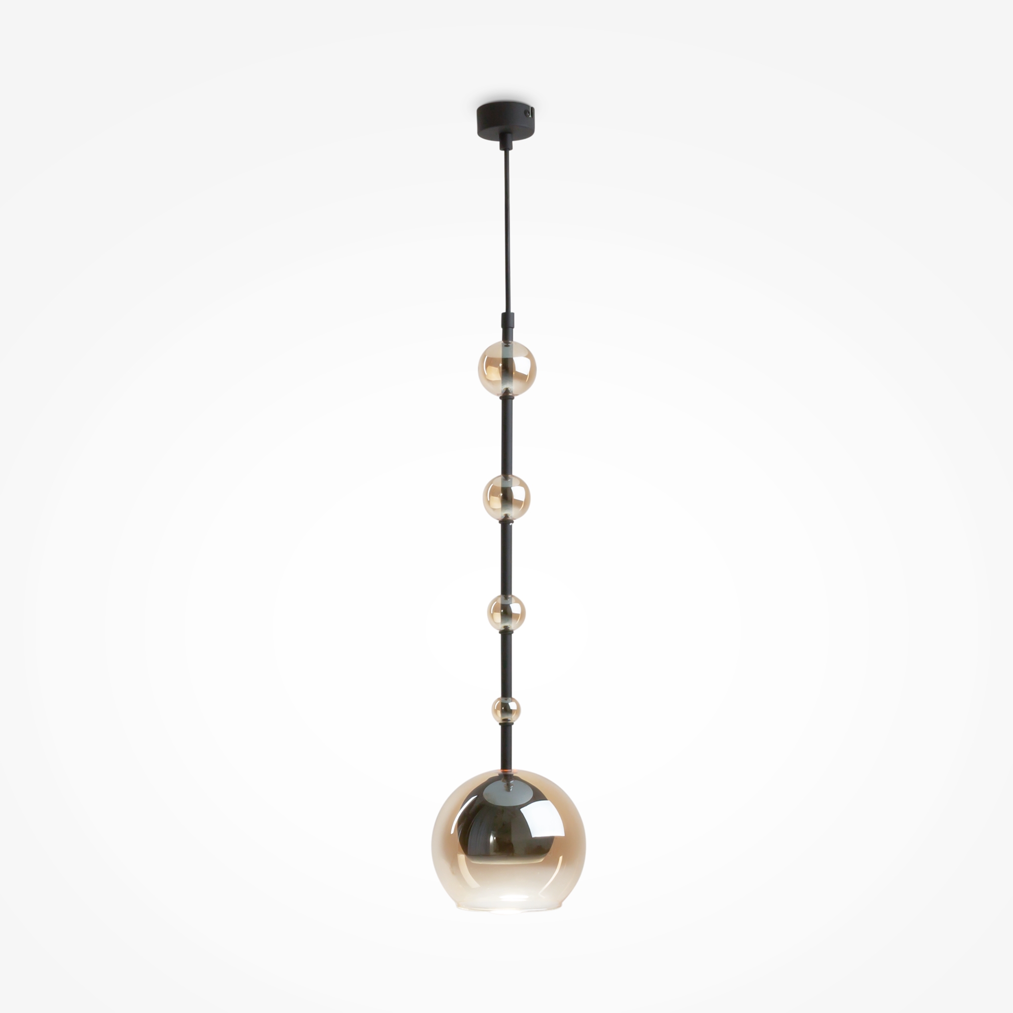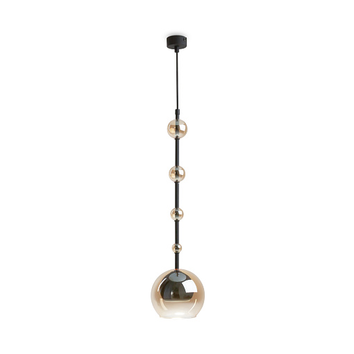 Арматура - металл, плафоны - стекло. Цветовый комбинации арматуры и плафона: черный + прозрачный, черный + янтарный, латунь + прозрачный. Элементы декора - выдувные бусины" из стекла. Высота проводов регулируется. Источник света - лампа с цоколем GU10.