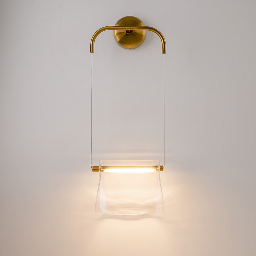 Цвет металлической арматуры — латунь с сатинированным финишем, плафоны — прозрачное стекло. Источник света: LED. Цветовая температура светильников 3000К, угол рассеивания — 120 градусов. Настенные бра и подвесные светильники оснащены регулируемым проводом длиной до 3 метров, что позволяет использовать их в помещениях с высокими потолками.