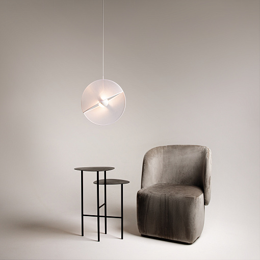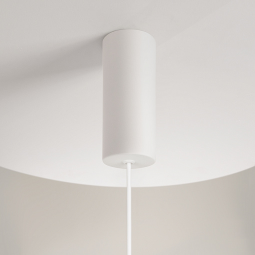 Арматура и плафон из металла и акрила. Цвет — белый. Декоративный светоотражающий элемент из полупрозрачной текстурированной ткани. Регулируемая высота. LED-источники света с цветовой температурой 3000К.