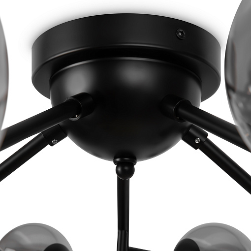 Металлическая арматура в четырех цветах: матовый черный, хром, золото, латунь. Плафоны — выдувное стекло. Цвета — дымчатый, янтарный, коньячный. Дизайн с имитацией молекулярной структуры. Высота подвесных светильников регулируется тросом. Лампа с цоколем G9.
