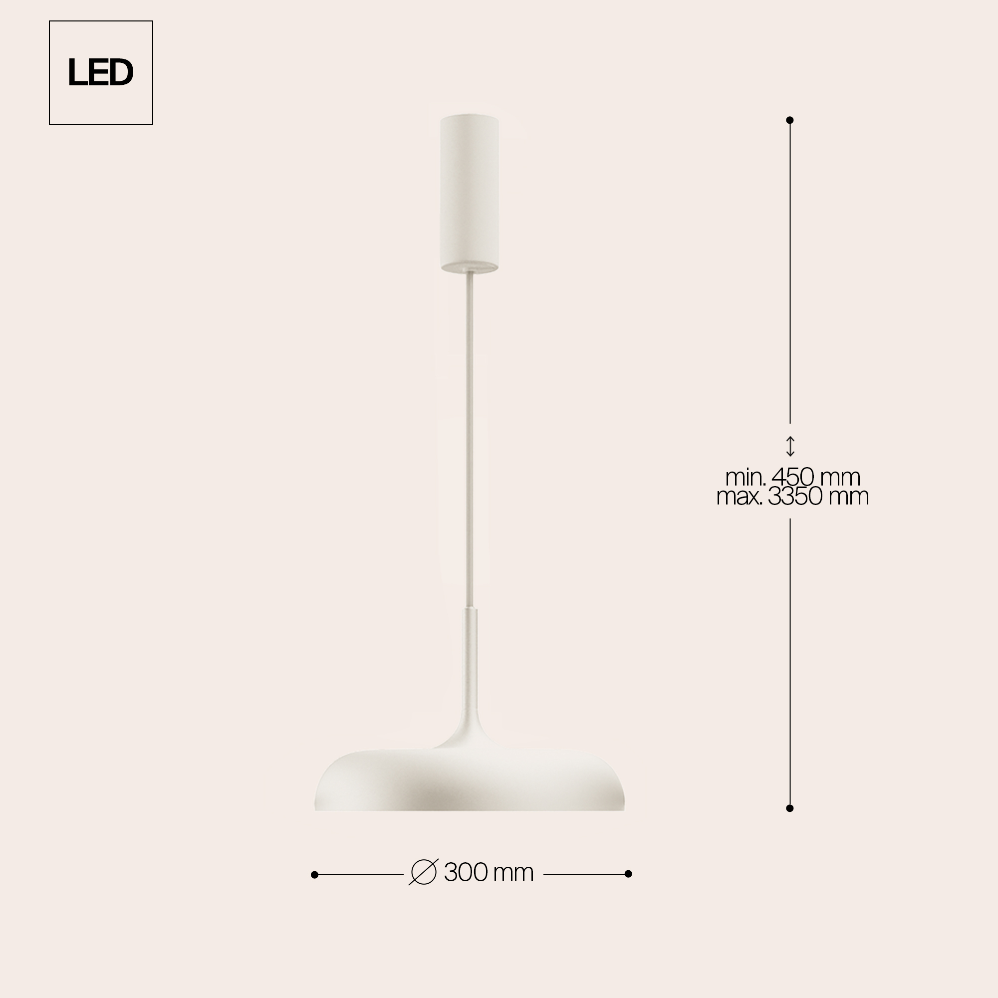 Арматура и плафон из металла,цвета - черный, белый, серый. Шагреневая поверхность - предотвращает следы от рук и пыли. Белый матовый рассеиватель из акрила хорошо пропускает свет, предотвращает слепящий эффект. Регулируемая длина провода - до 3 метров. LED-источник света. Цветовая температура 3000К.