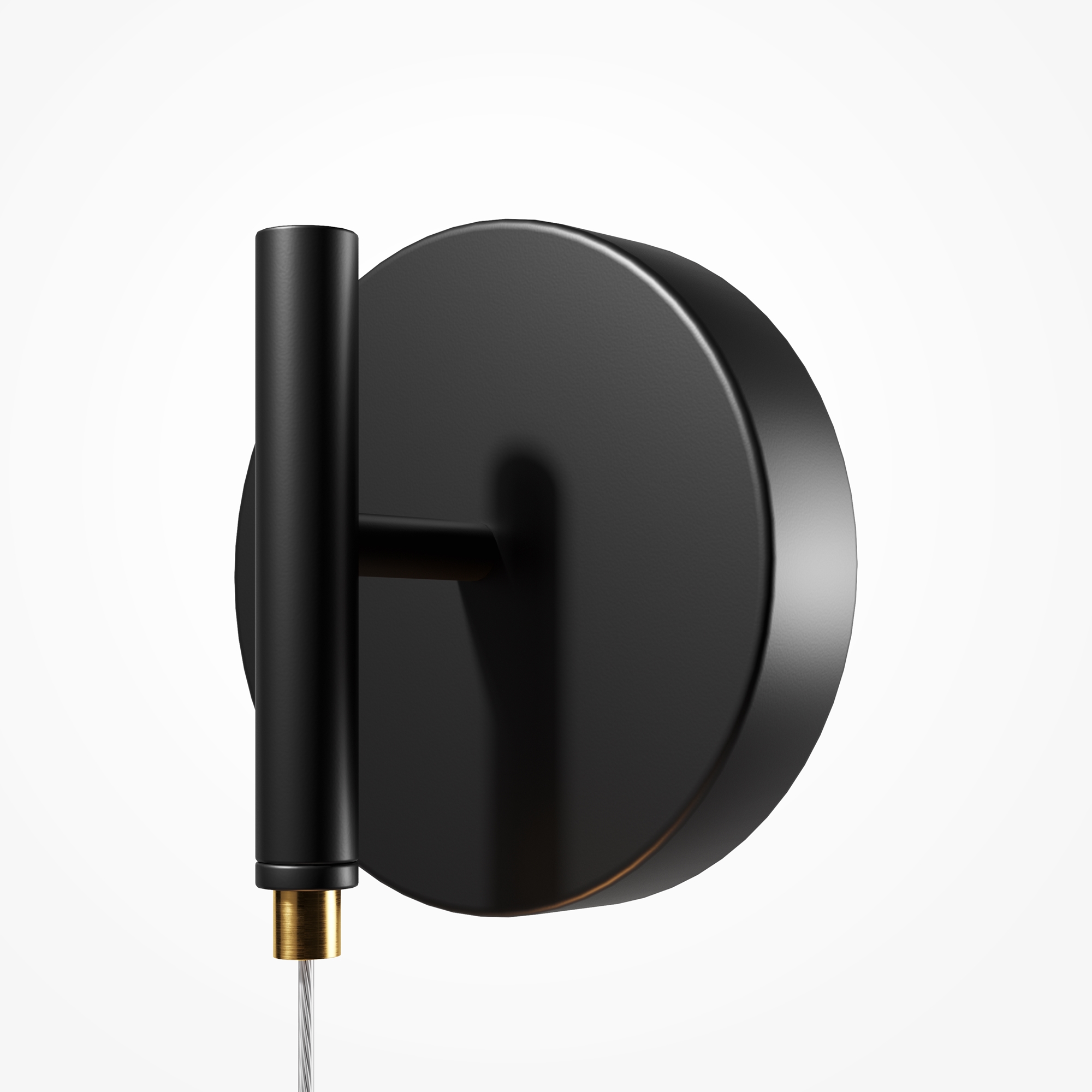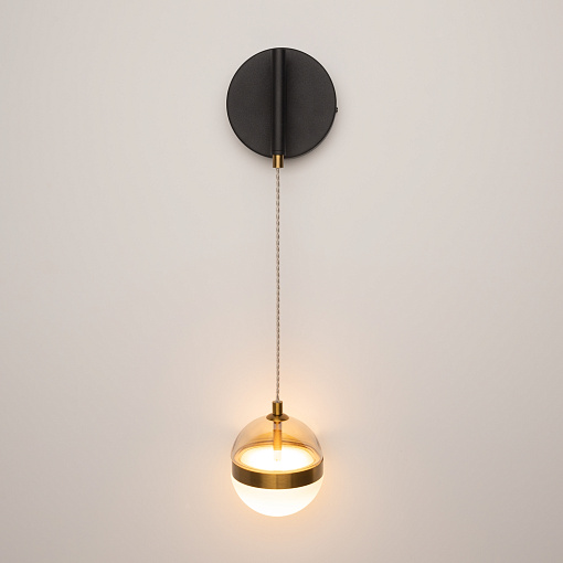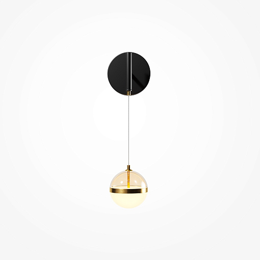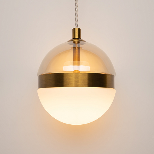 Черная потолочная чаша дополнена финишным антибликовым покрытием sandy, декоративный элемент плафона выполнен из металла цвета сатинированной латуни. Сочетание двух фактурных стекол в плафоне: нижняя полусфера из матового белого стекла для создания мягкого рассеянного  света, верхняя часть плафона - из тонированного янтарного стекла. Внутри установлен LED-модуль, создающий равномерное освещение, направленное вверх и вниз. Цветовая температура – 3000К, угол рассеивания — 120°.