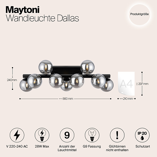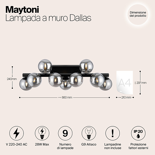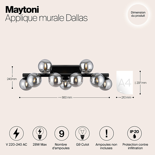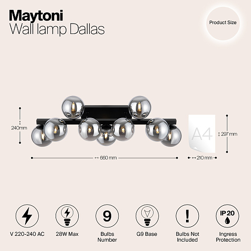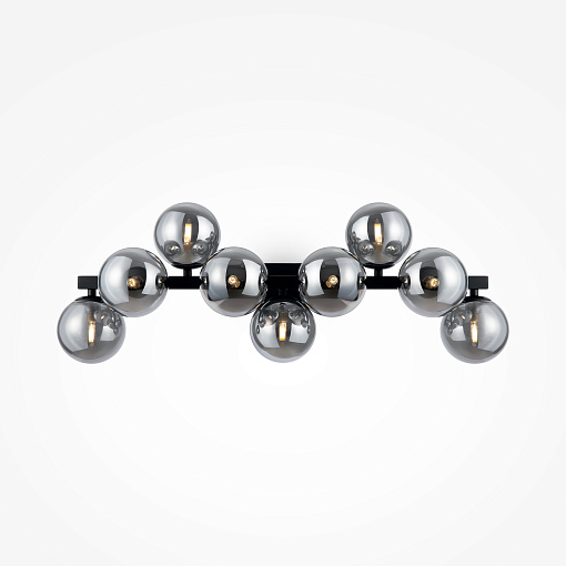 Металлическая арматура в четырех цветах: матовый черный, хром, золото, латунь. Плафоны — выдувное стекло. Цвета — дымчатый, янтарный, коньячный. Дизайн с имитацией молекулярной структуры. Высота подвесных светильников регулируется тросом. Лампа с цоколем G9.