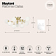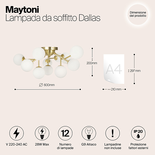 Металлическая арматура в четырех цветах: матовый черный, хром, золото, латунь. Плафоны — выдувное стекло. Цвета — дымчатый, янтарный, коньячный. Дизайн с имитацией молекулярной структуры. Высота подвесных светильников регулируется тросом. Лампа с цоколем G9.