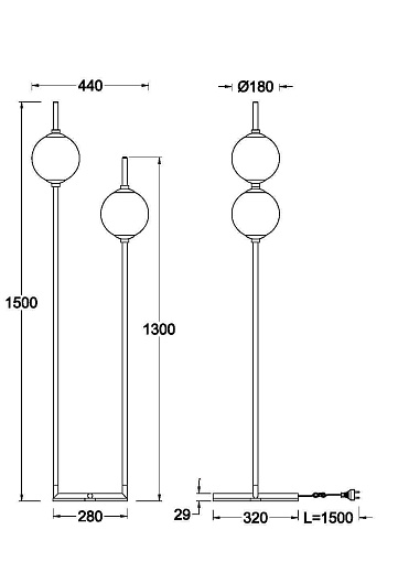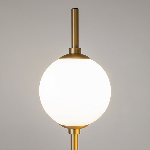 Металлическая арматура в черном цвете. Плафоны-сферы из белого стекла. LED-источник света с цветовой температурой 3000К. Удобные выключатели вверхней части арматуры. Функция раздельного включения световых элементов