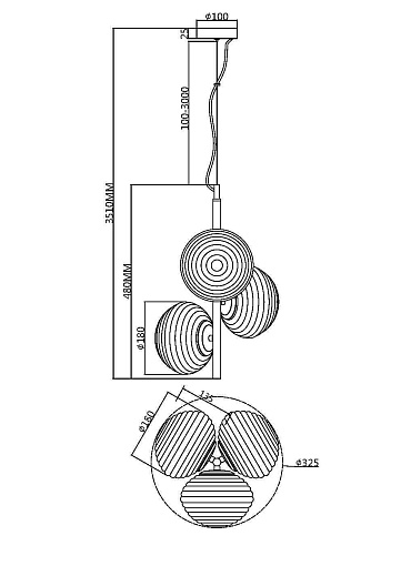 Материал арматуры - металл, цвета - черный, золото. «Динамичные» круглые плафоны со спиральным рельефом. Материал плафонов - стекло, цвета - белый матовый, глянцевый дымчатый. Провод 3  метра, длина регулируется. Источник света - лампы с цоколем Е14, Е27.