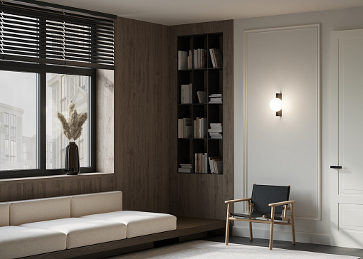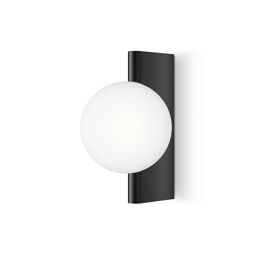 Арматура из металла, оттенки – матовый черный, латунь, хром. Плафон-сфера – стекло, цвет – белый. Скрытое крепление. Оригинальная геометрия в дизайне. Чистый теневой рисунок