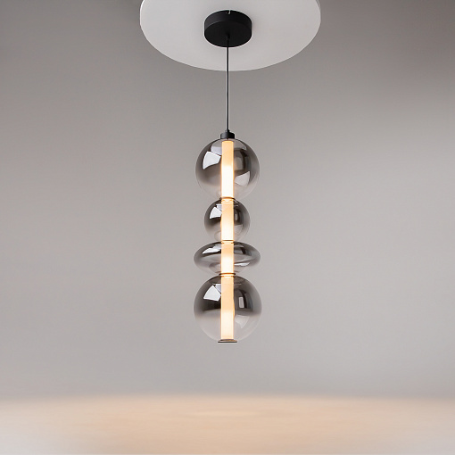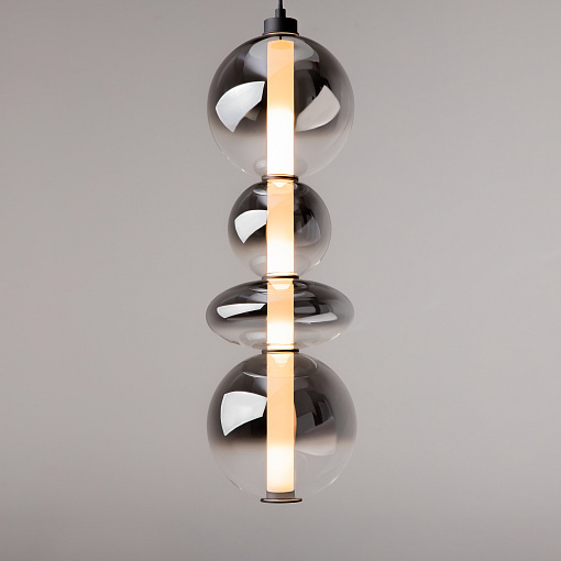 Светильники с тонированными выдувными стеклянными плафонами (дымчатыми  или янтарными) и металлической арматурой (черной или цвета латуни). Окрашивание плафонов градиентное. Источник света: LED. Световой элемент установлен внутри акрилового рассеивателя. Цветовая температура источника света – 3000К, угол рассеивания — 120°. Торшеры снабжены Push-кнопкой на проводе.