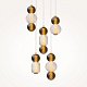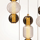 Материал арматуры - металл, цвета - золото, хром. Микс плафонов: гладкие cферы коньячного или дымчатого оттенка + округлые рельефные с ромбовидным узором из прозрачного стекла. Регулируемая высота подвесных моделей - максимальная длина провода 3 метра. LED-источник света, цветовая температура 3000К