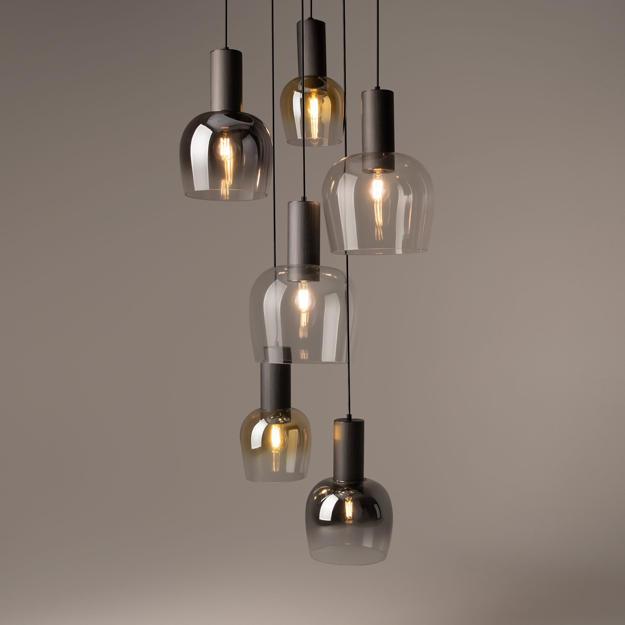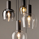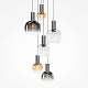 Цветовая гамма: дымчато-серый или насыщенно-янтарный цвет стекла в сочетании с черной или золотой арматурой. В серии есть модели светильников со сменным источником света с цоколем Е27 (каскадная композиция, потолочный и настольные светильники) и LED-источником (одинарные подвесные светильники). Температура свечения LED – 3000 К, угол рассеивания — 120 градусов. Плафоны каскадной композиции плафоны разных размеров и оттенков, установленные на одно основание. Оригинальный декор — актуальный вариант современной классики.