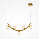 Металлическая арматура цвета латуни с сатинированным эффектом. Яркие небольшие плафоны диаметром 80 мм цвета янтаря.  Встроенный LED источник света дает мощный световой поток с цветовой температурой 3000К и углом рассеивания 120 градусов. Подвесные светильники выполнены в виде перевернутой арки и в трендовой форме круга, расположение плафонов настенного светильника напоминает созвездие.