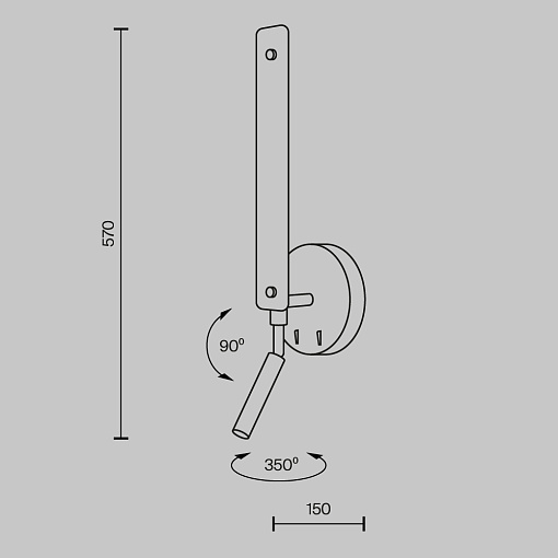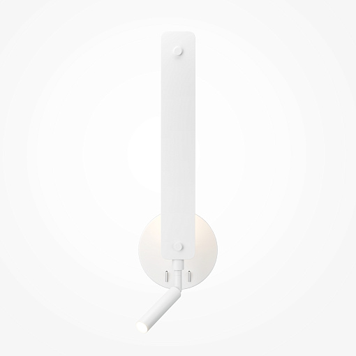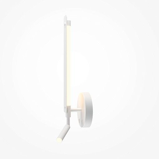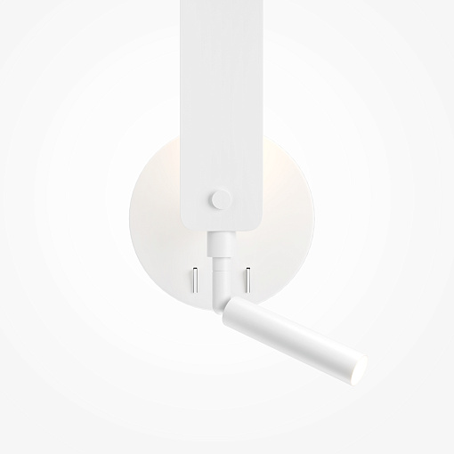 Металлическая арматура черного и белого цвета с шагреневым финишем. Источник света — LED. Конструкция бра предусматривает 2 источника света: поворотный спот для направленного освещения, подсветка вдоль корпуса для создания переотраженного света. Есть две кнопки на  корпусе для управления. У торшера - только переотраженный свет вдоль всего корпуса. Угол рассеивания — 120°.