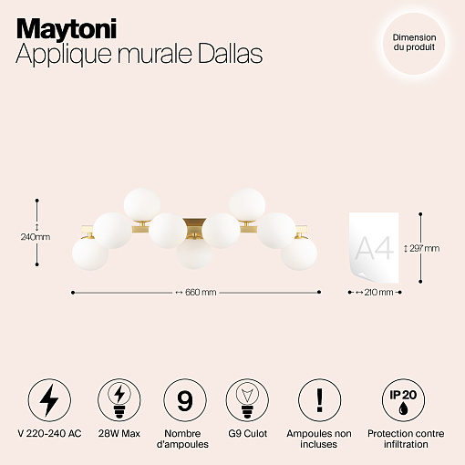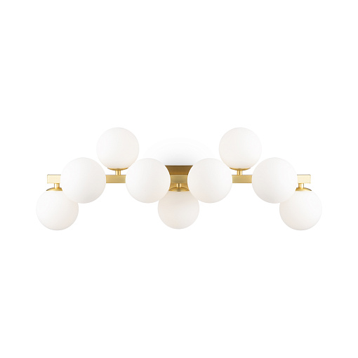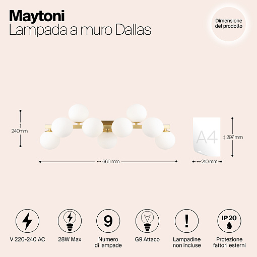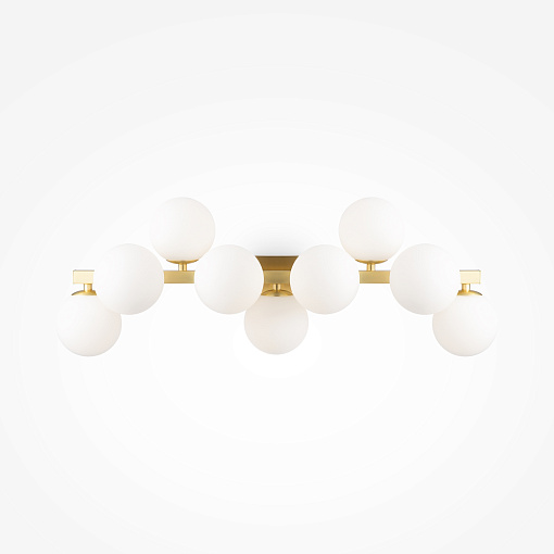 Металлическая арматура в четырех цветах: матовый черный, хром, золото, латунь. Плафоны — выдувное стекло. Цвета — дымчатый, янтарный, коньячный. Дизайн с имитацией молекулярной структуры. Высота подвесных светильников регулируется тросом. Лампа с цоколем G9.