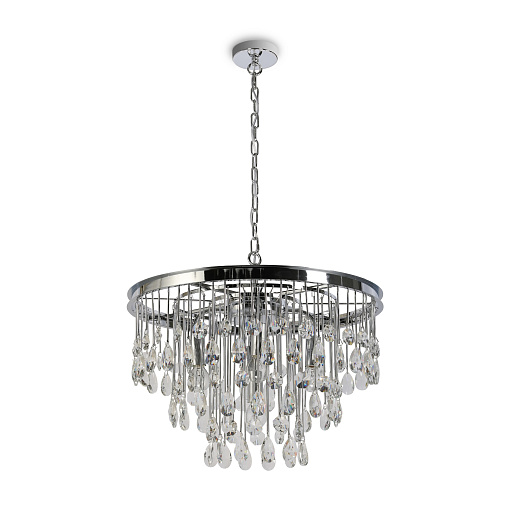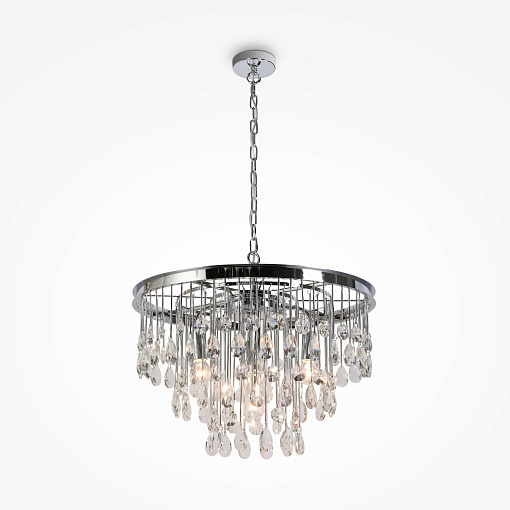 Материал арматуры – металл, оттенки – золото и хром. Комбинация металла и хрусталя в декоре. Металлические трубки гальванизированы в тон арматуре. Хрустальные подвески обрамляют композицию. Высота люстр регулируется с помощью цепи. Цоколь Е14.