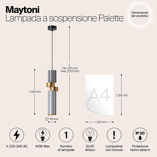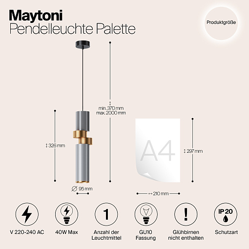 Металлическая арматура сочетает серый, золотой и серебряный цвет. Комбина ция цилиндрических форм в дизайне. Высота регулируется с помощью кабеля. Цоколь GU10