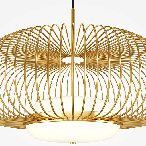 Цвет арматуры — латунь. Материал арматуры — металл. Абажур — каркас из проволоки, стекло. Оригинальный дизайн с эффектом левитации. Стеклянный рассеиватель со специальным выступом для крепления проволочного плафона. Два типа подвесных светильников: компактные со сменными лампами и крупный с LED-модулем для двунаправленного освещения. Провод длиной 3 метра для высоких потолков. Регулируемая высота подвеса. Универсальный дизайн для неоклассики, эклектики и фьюжн.
