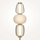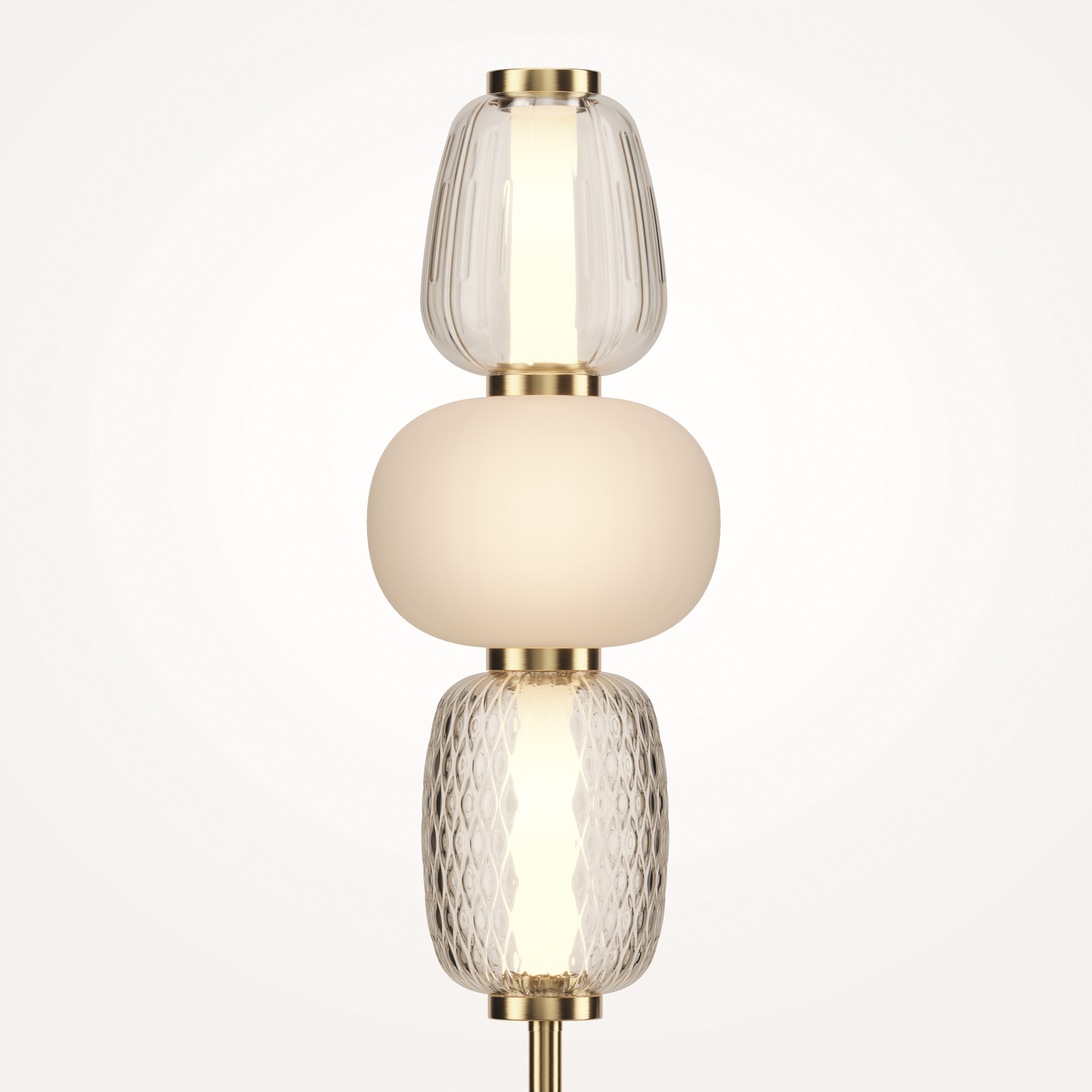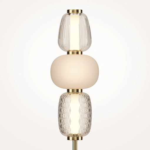 Металлическая арматура, цвет - золото, хром. Микс плафонов округлых и вытянутых форм из белого  матового и прозрачного стекла с сетчатым и с линейным повторяющимся рельефным рисунком. Регулируемая высота подвесных моделей, провод - 3 метра. LED-источник света, цветовая температура  3000К.