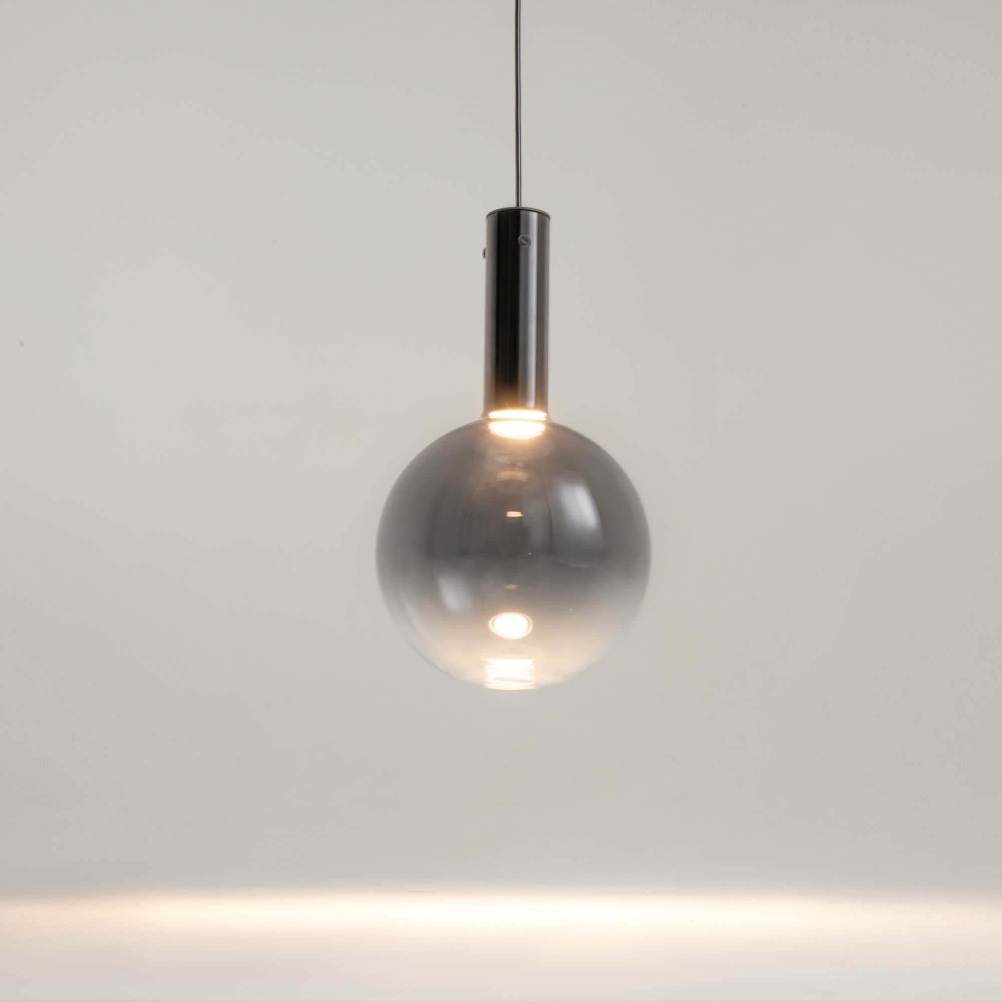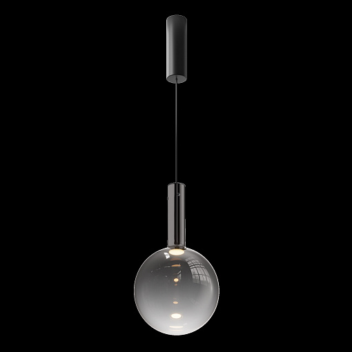 Металлическая арматура, цвет - черный, белый.  Выдувной плафон-шар из стекла с вытянутым цилиндрическим основанием в трех цветах: дымчато-черный, туманно-белый, бежево-коньячный. LED-источник света в основании плафона. Цветовая температура 3000К. Два диаметра плафонов и регулируемая длина проводов для создания разнообразных композиций.