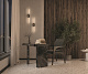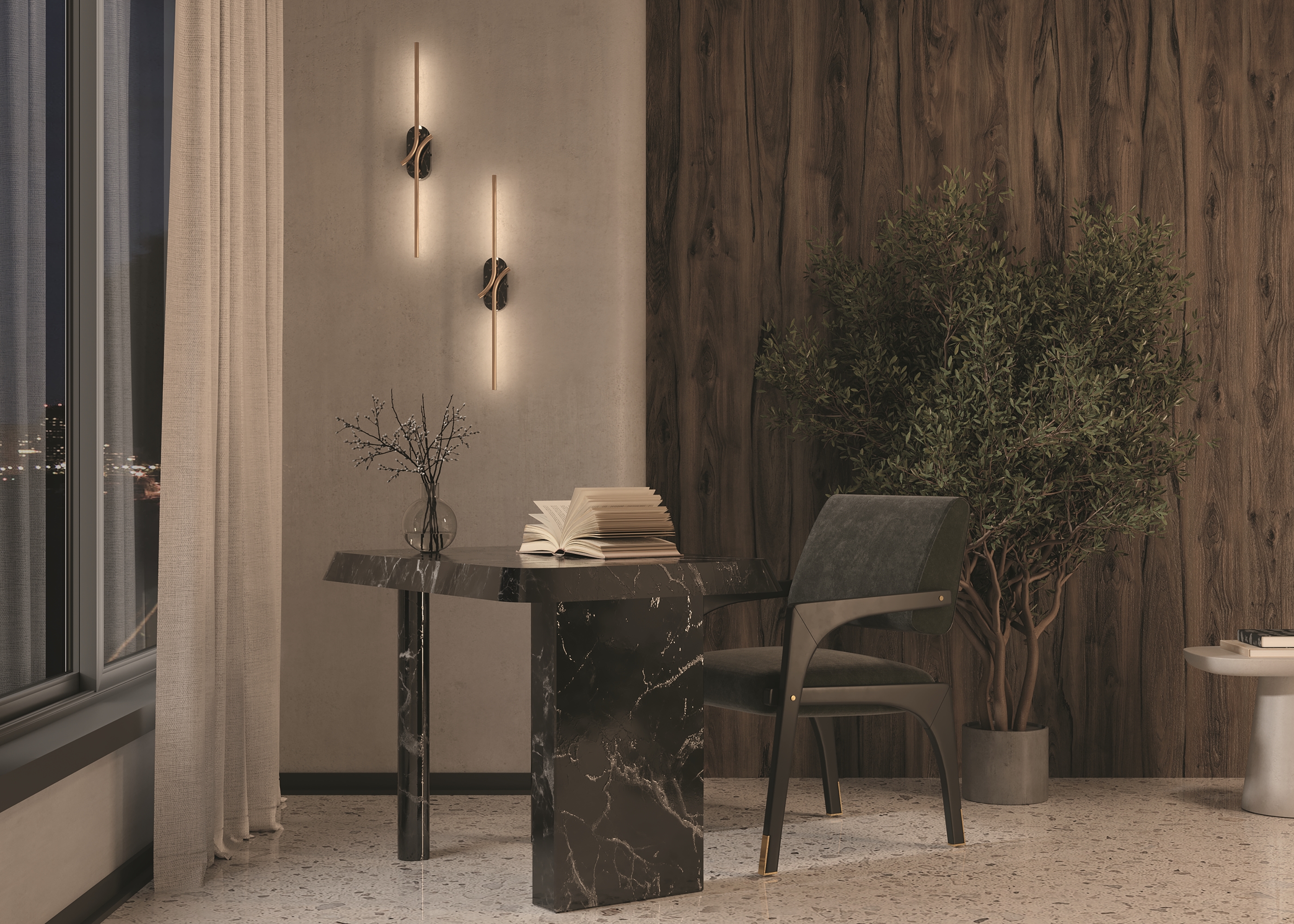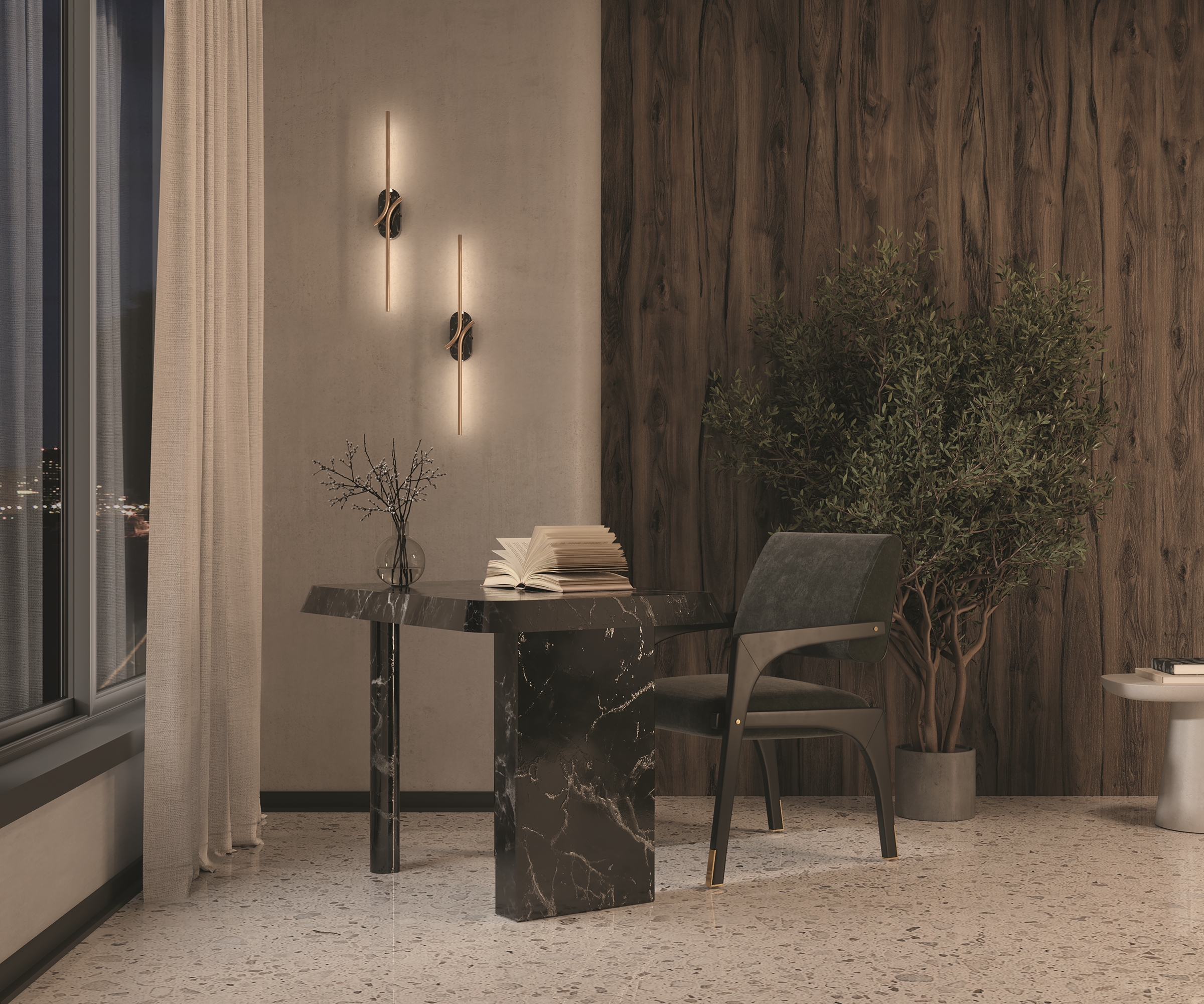 Два варианта основания корпуса. Металлический, цвета – черный и сатинированная латунь.  Мрамор, цвета - черный и серый. Плафон-трубка из металла со скрытым рассеивателем. Серия отражает эстетические чувства эпохи Возрождения, искусно сочетая цветовые палитры,  формы и материалы, характерные для того периода. LED источник света. Цветовая температура - 3000К.