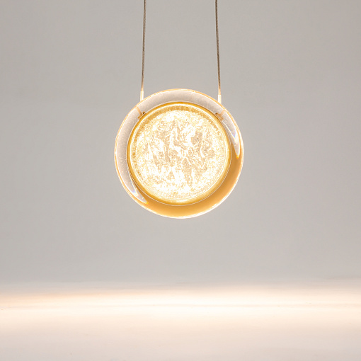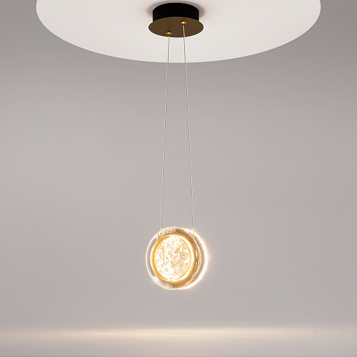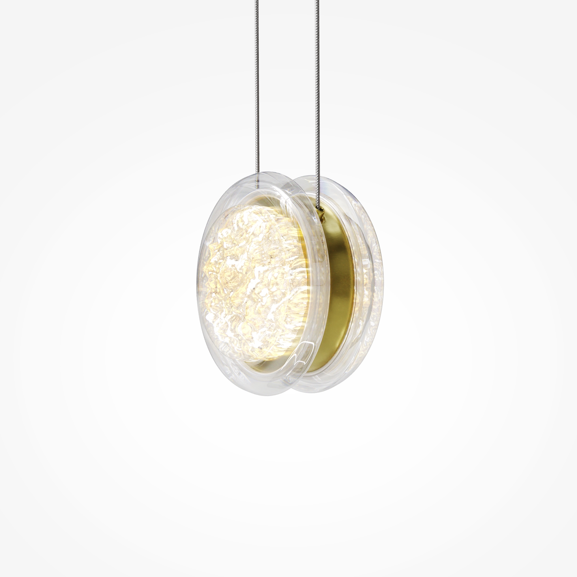 Арматура из металла цвета латунь с сатинированным финишным покрытием сочетается с прозрачными плафонами. Подвесные одинарные, горизонтальный и каскадные светильники оснащаются LED-модулем с двумя плоскими плафонами из акрила со сложным, актуальным паттерном на поверхности. Цветовая температура — 3000К, угол рассеивания — 125 градусов.