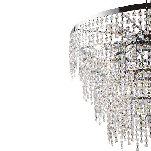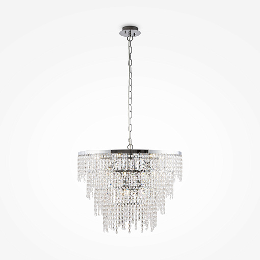 Материал арматуры – металл, цвет – хром. Многоярусный стеклянный декор. Эффектная игра света. Визуально легкий дизайн. Высокие параметры освещенности. Регулируемая высота