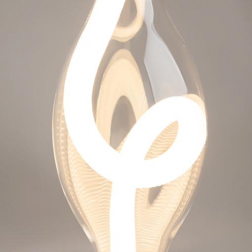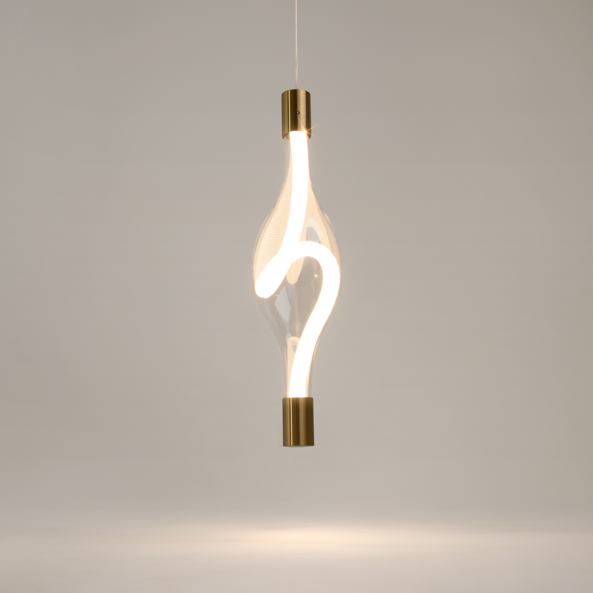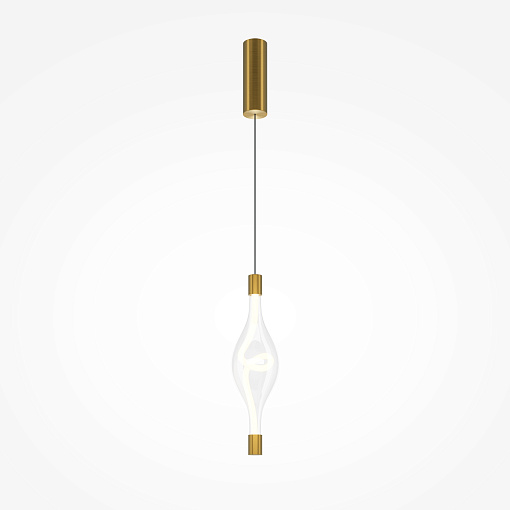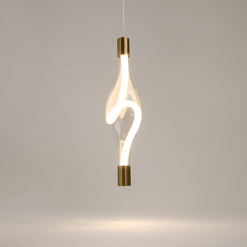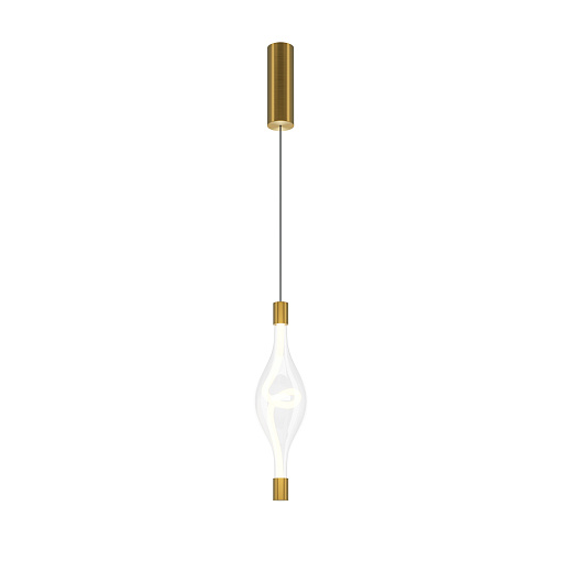 Арматура из металла в цвете латуни, плафоны — прозрачное стекло. LED-источник света в виде светодиодного тканевого шнура, цветовая температура 3000К и угол рассеивания 360°. Трендовая форма петли светодиодного шнура. Тросы подвесов регулируются по высоте до трех метров. Могут использоваться как основной источник света.