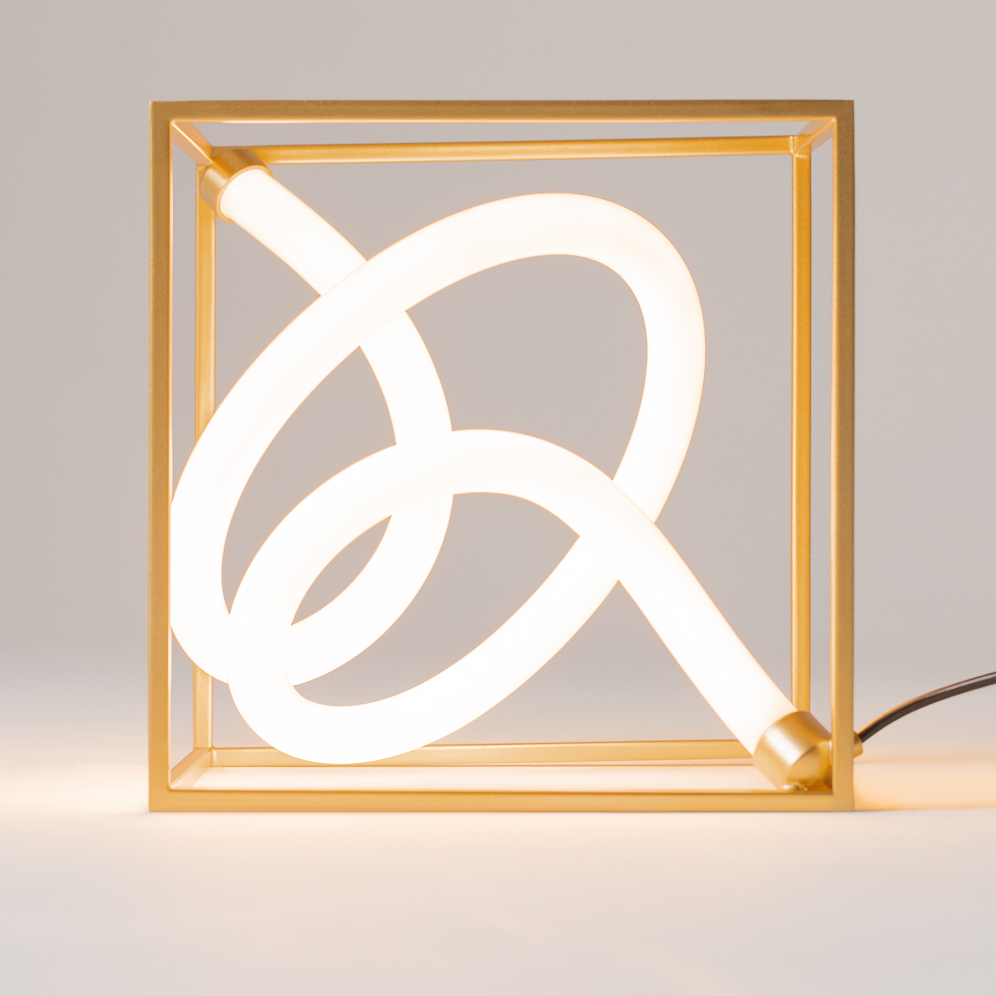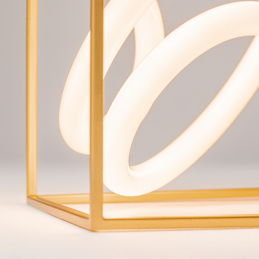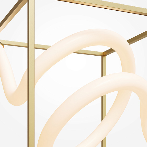 Металлическая арматура, цвет - латунь. Графичный силуэт. Источник света  - гибкая неоновая трубка, расположенная внутри арматуры.   Угол рассеивания — 120 градусов. Дизайн светильников подходит для интерьера в стиле лофт, а также индустриального стиля. Регулируемый провод подвесного светильника — 3 м.