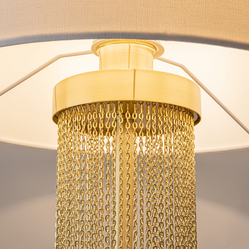 Арматура из нержавеющей стали. Цвет — золото. Абажур — белая ткань. Декоративные цепочки в тон арматуре. Съемный тканевый рассеиватель смягчает световой поток. Источники света — лампы с цоколем Е14.