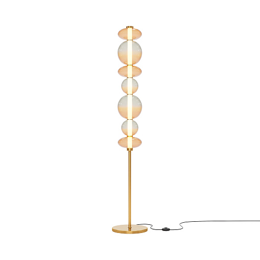 Светильники с тонированными выдувными стеклянными плафонами (дымчатыми  или янтарными) и металлической арматурой (черной или цвета латуни). Окрашивание плафонов градиентное. Источник света: LED. Световой элемент установлен внутри акрилового рассеивателя. Цветовая температура источника света – 3000К, угол рассеивания — 120°. Торшеры снабжены Push-кнопкой на проводе.