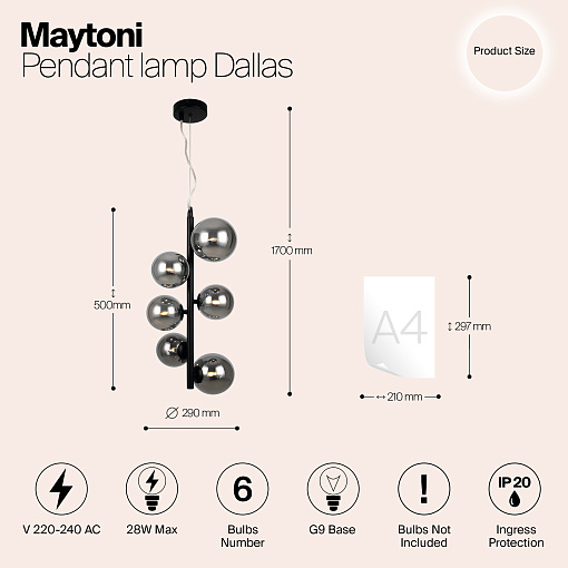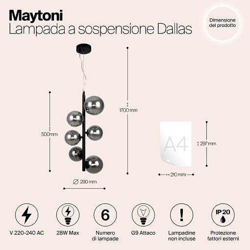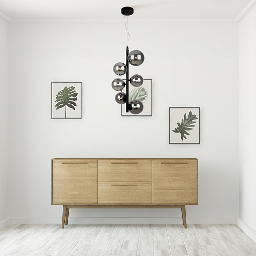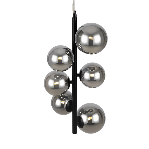 Металлическая арматура в четырех цветах: матовый черный, хром, золото, латунь. Плафоны — выдувное стекло. Цвета — дымчатый, янтарный, коньячный. Дизайн с имитацией молекулярной структуры. Высота подвесных светильников регулируется тросом. Лампа с цоколем G9.