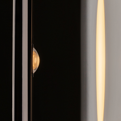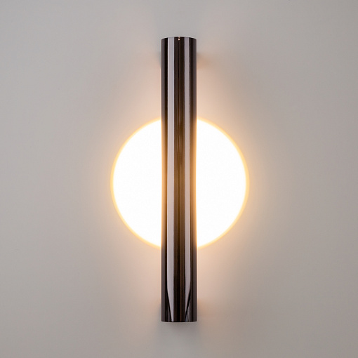 Металлическая арматура, цвета: черный, хром, золото. Источник света: LED-светодиод. Световая температура 3000К. Свет переотраженный, угол рассеивания 100 градусов. Дизайнерское решение с использованием линзы, создающей акцентный круг на стене и эффекта переотражения. Поверхность арматуры глянцевая, полузеркальная. Бра подойдет для зонирования помещений.