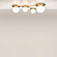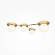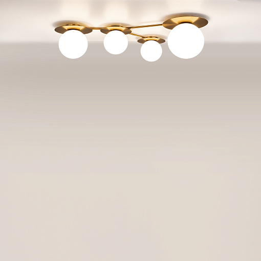 Компактное металлическое основание и  арматура цвета латуни. Две модели с плафонами белого цвета и две с разноцветными плафонами: серый, прозрачный, дымчатый и оттенка коньяка. Источник света: цоколь Е14. Компактное основание светильника прилегает к потолку. Функциональное основное освещение. Местоположение разноцветных плафонов можно менять, создавая композиции по своему вкусу. Поверхность плафонов имеет орнамент, при включении светильника на потолке создаются узоры.