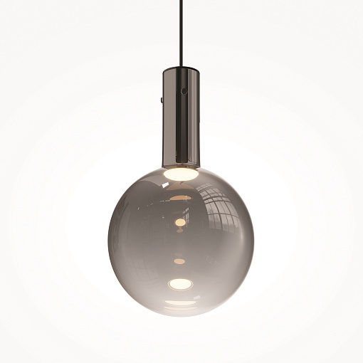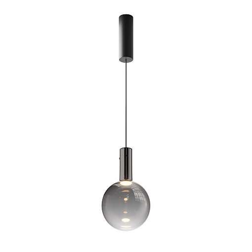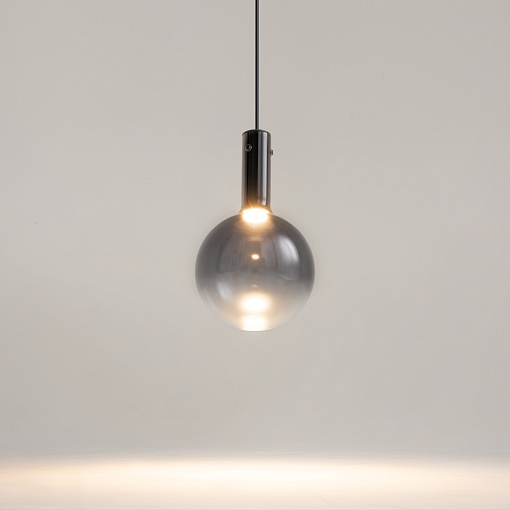 Металлическая арматура, цвет - черный, белый.  Выдувной плафон-шар из стекла с вытянутым цилиндрическим основанием в трех цветах: дымчато-черный, туманно-белый, бежево-коньячный. LED-источник света в основании плафона. Цветовая температура 3000К. Два диаметра плафонов и регулируемая длина проводов для создания разнообразных композиций.