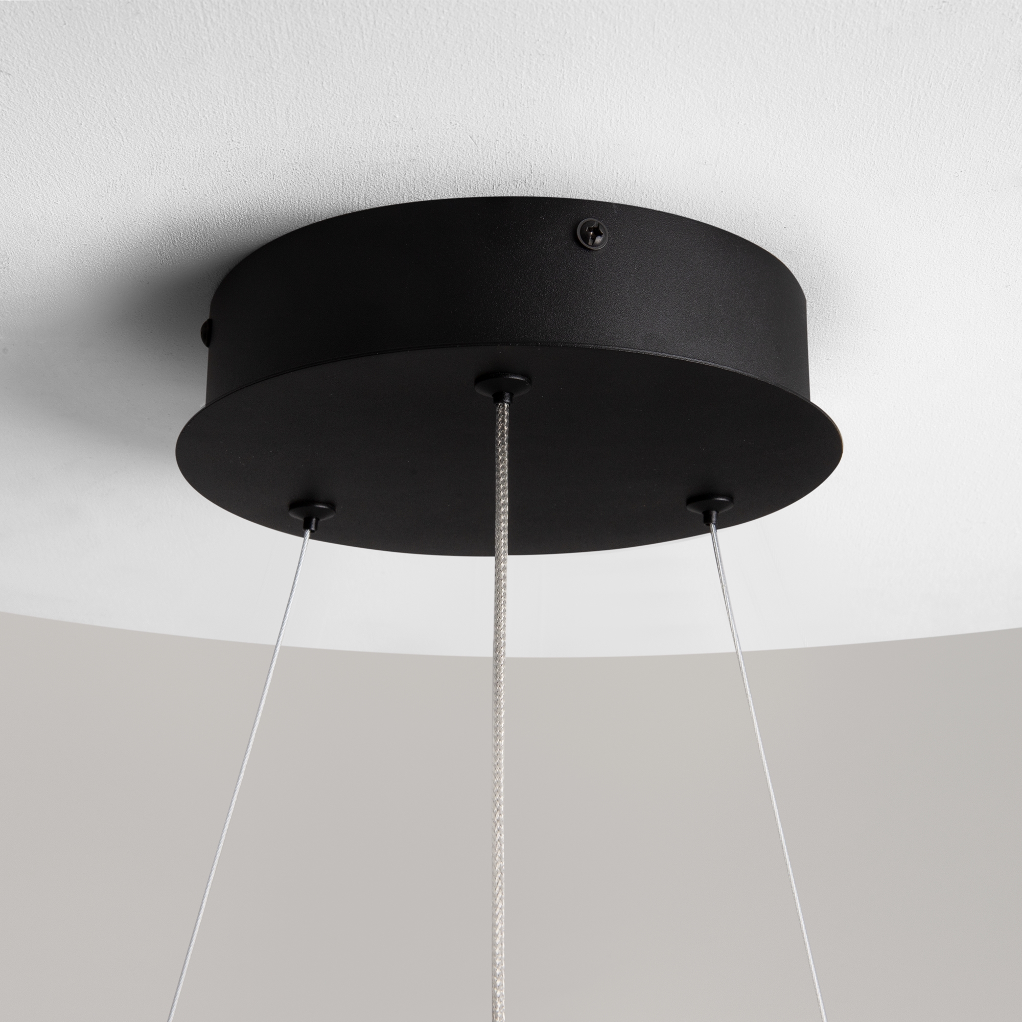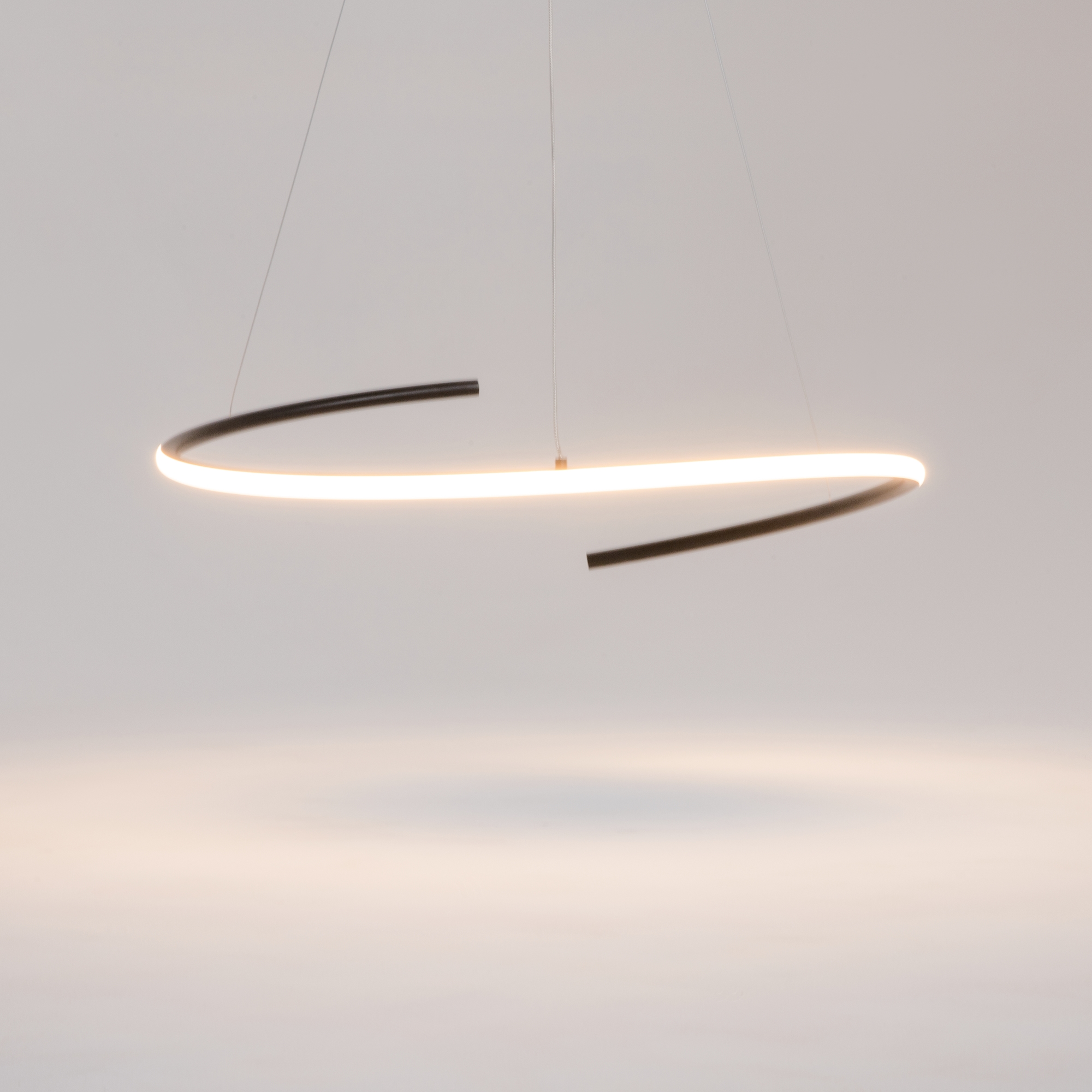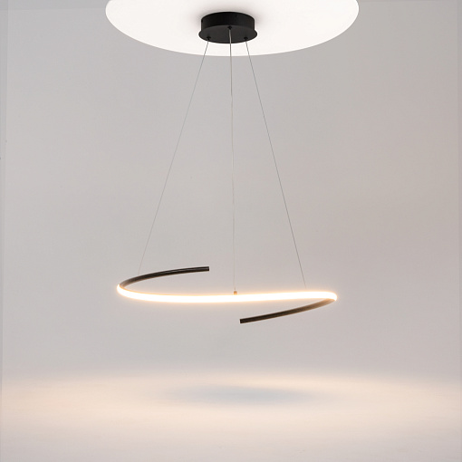 Металлическая арматура, цвета - черный, латунь. Закругленные световые элементыиз силикона со  встроенным LED-источником света по всему периметру. Регулируемый диапазон цветовой тмепературы 2600К-3500К для светильников в латуни и 3000К-4000К для черных. Регулируема длина тросов.  Фантазийный образ хаотичных фрагментов свободно парящих в пространстве.