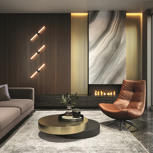 Материал арматуры – алюминий, цвет – золото. Настенные модели в трех оттенках арматуры: золото, черный, белый. Плафоны-трубки из матового акрила равно мерно распределяют свет. Трендовая асимметрия в дизайне люстр. LED-источники света с цветовой температура 3000К.