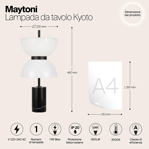 Материал арматуры – металл, цвет – черный, золото, белый. Мраморное основание в черном, сером, белом цветах. Плафоны из белого стекла. Дизайн светильника вдохновлен архитектурой одноименной древней японской столицы – Киото. LED источник света, цветовая температура - 3000К.