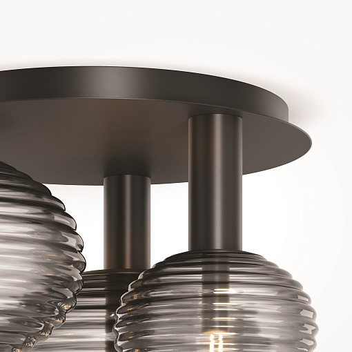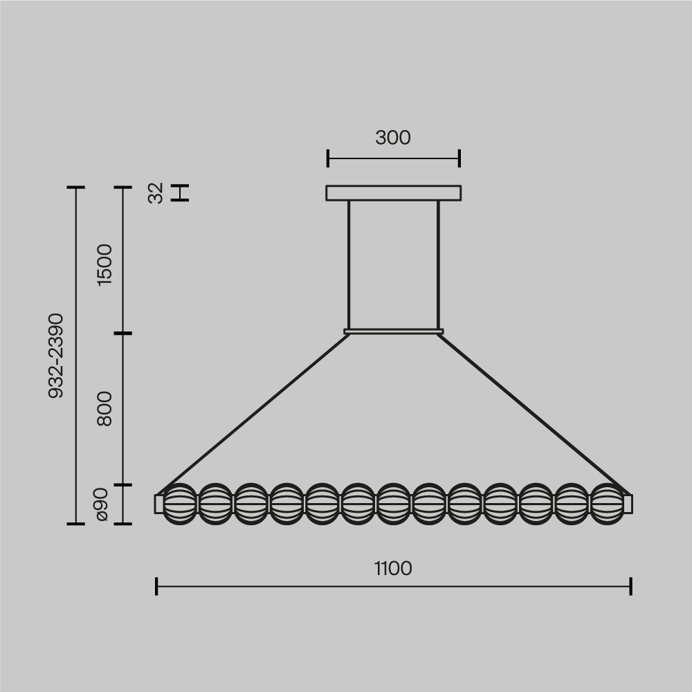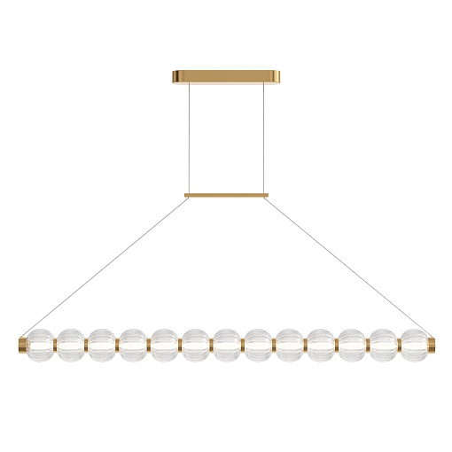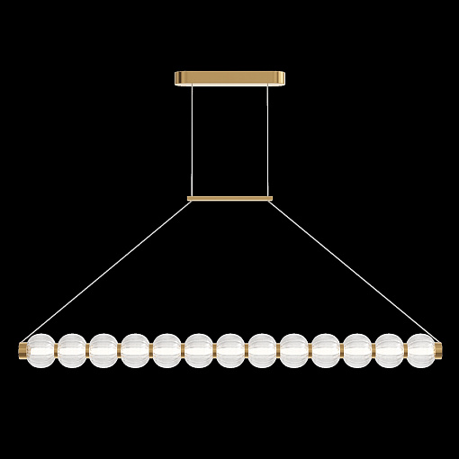 Арматура из металла, цвет – хром. Акцентный декор в виде рельефных сфер из литого стекла. Источник света – светодиодная лента – скрыта под акриловым рассеивателем. Регулируемая высота подвесных светильников.