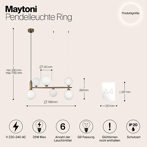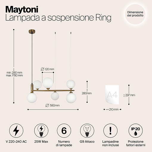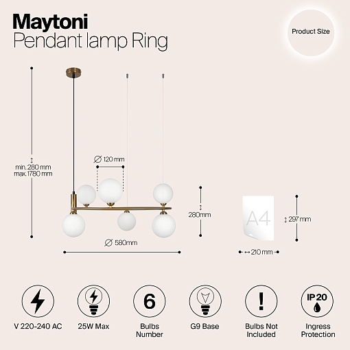 Арматура из металла в трех оттенках: белый, черный, латунь. Плафоны-сферы закреплены на округлом металлическом каркасе. Материал плафонов — выдувное стекло, цвет — белый. Высота подвесных моделей регулируется.