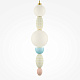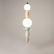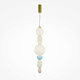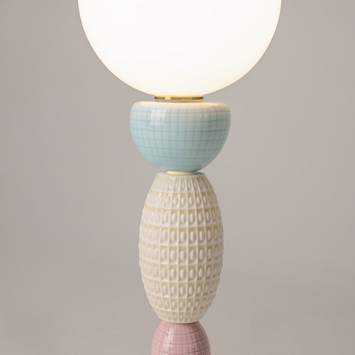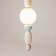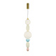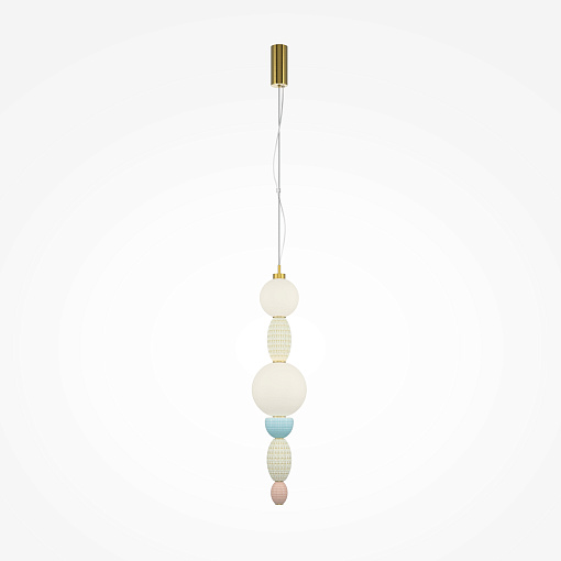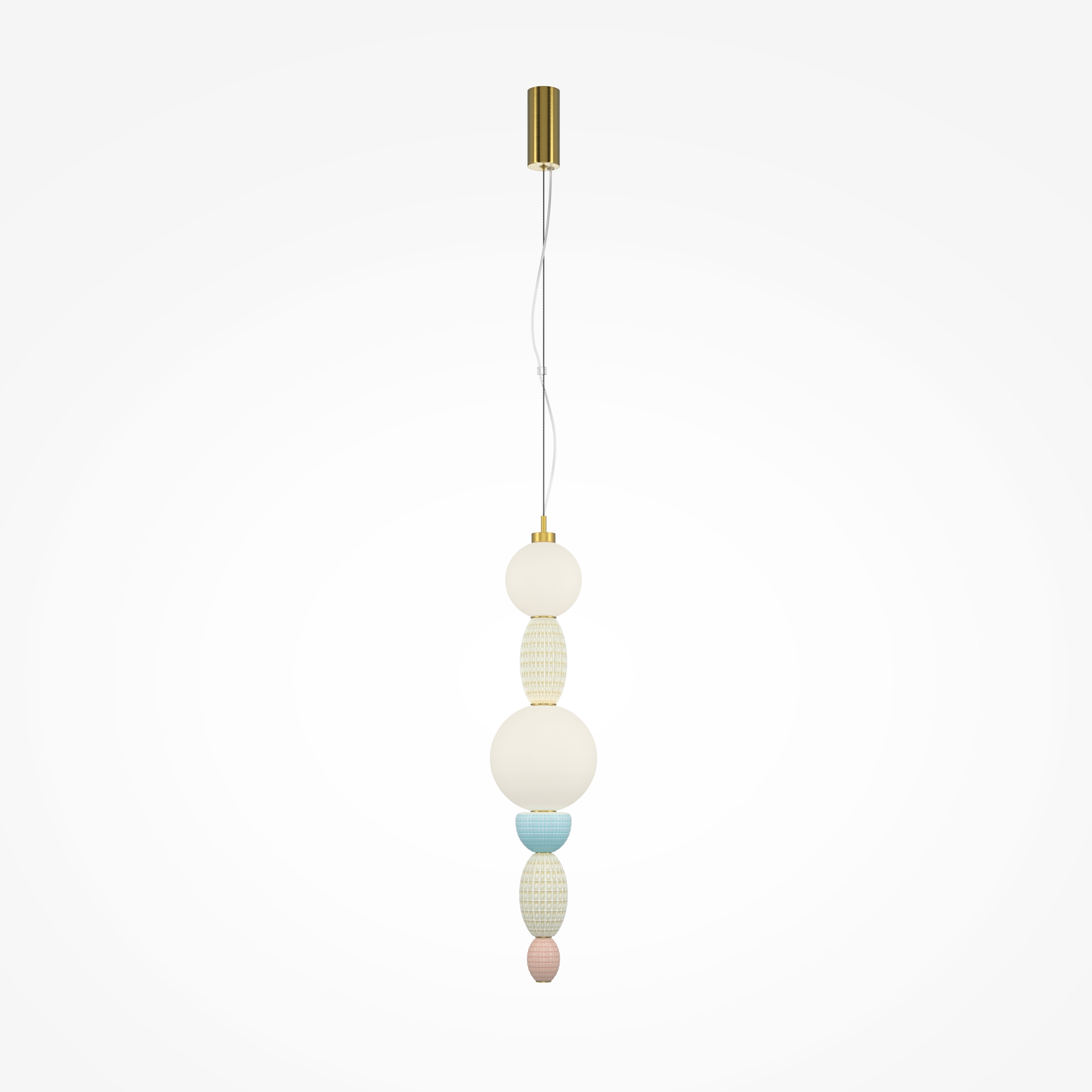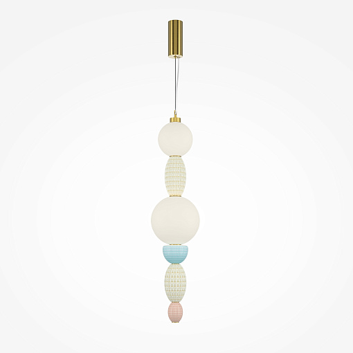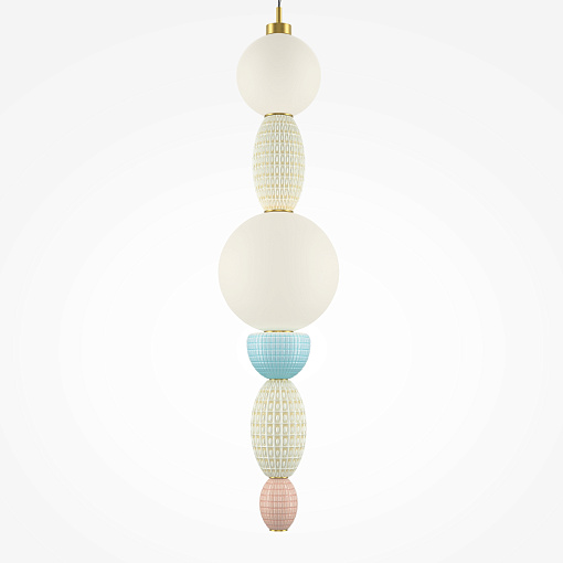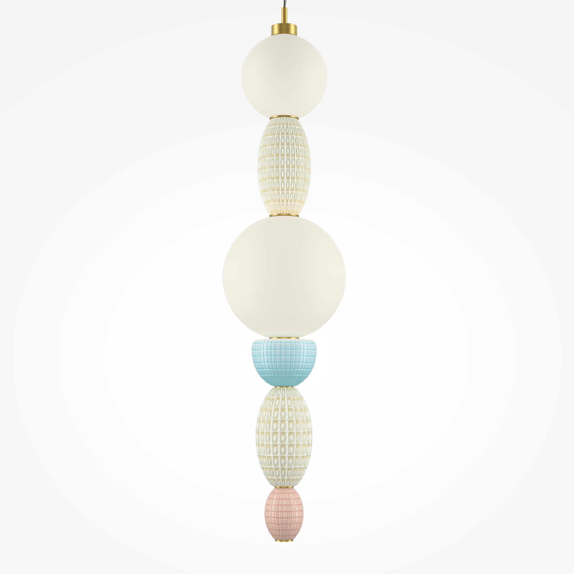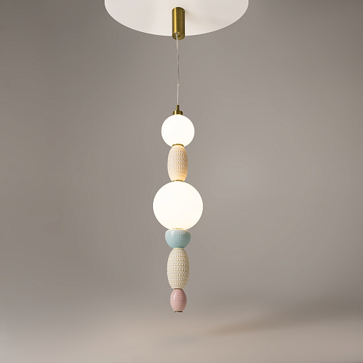 Металлическая арматура цвета латуни. Плафоны из белого стекла для мягкого, равномерного освещения, декоративные элементы из цветной керамики. Угол рассеивания 120°. Цветовая температура – 3000 К. Регулируемый провод длиной 3 м.