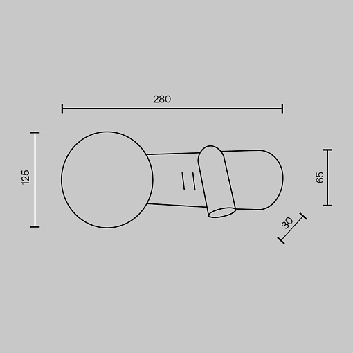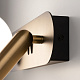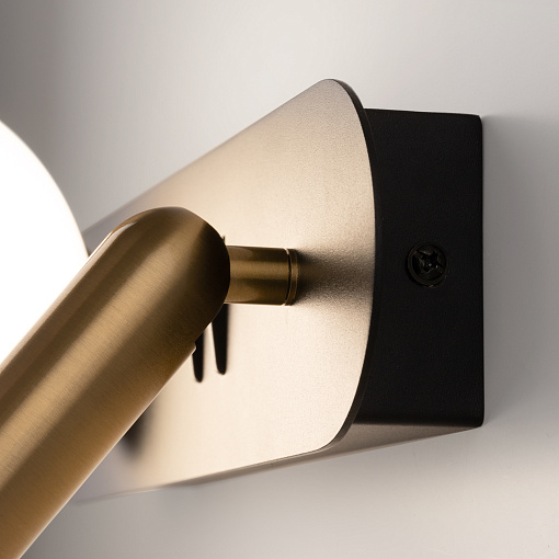 Арматура черного цвета дополнена латунными элементами, стеклянные плафоны — белые матовые. Спот для направленной подсветки снабжен LED-источником света, в плафон устанавливается встроенная лампа с цоколем G9. Цветовая температура — 3000 К, смешанный тип рассеивания. Провод длиной 3 метра можно регулировать по длине. На корпусе бра предусмотрены отдельные кнопки для управления источниками света.