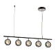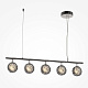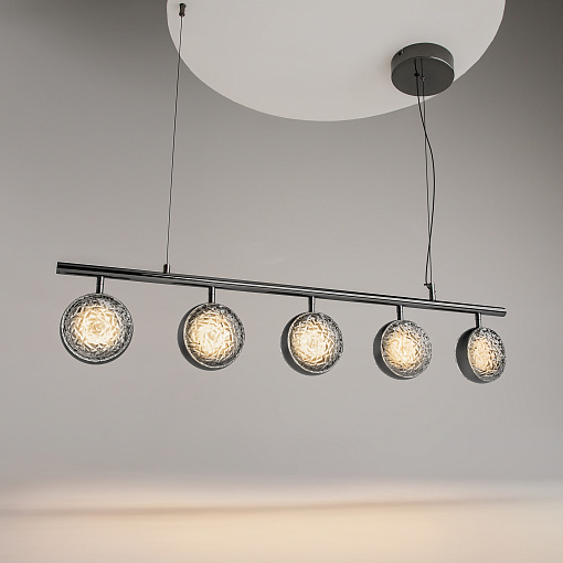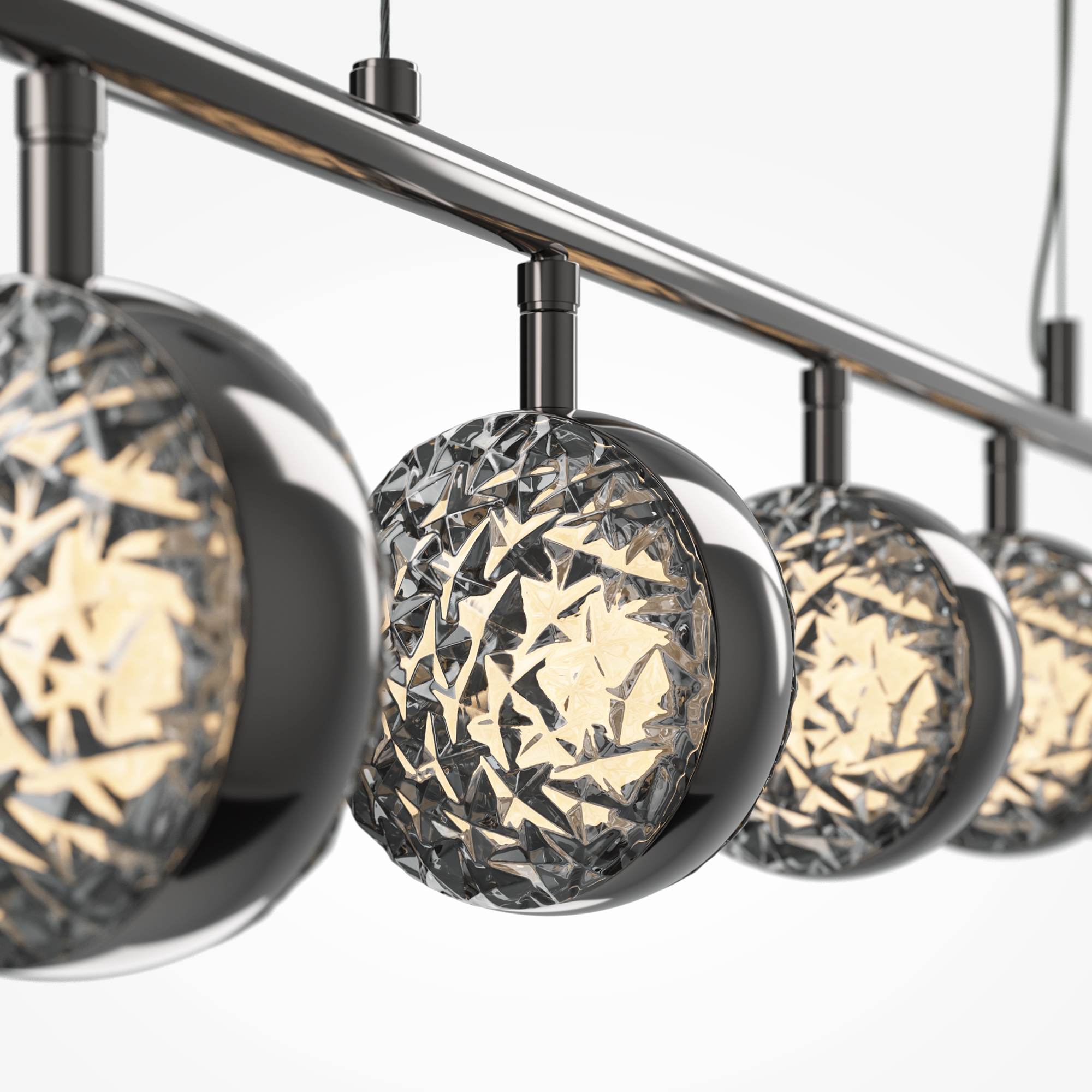 Два цветовых сочетания: сатинированная арматура из металла в цвете латунь в комбинации со стеклянными плафонами янтарного оттенка или  трендовый черный хром с глянцевым финишем в сочетании с тонированными светло-серыми плафонами. Источник света: LED. Цветовая температура 3000К, угол рассеивания 120 градусов. Провод длиной 3 м можно регулировать по высоте — светильник подходит для помещений с высокими потолками.