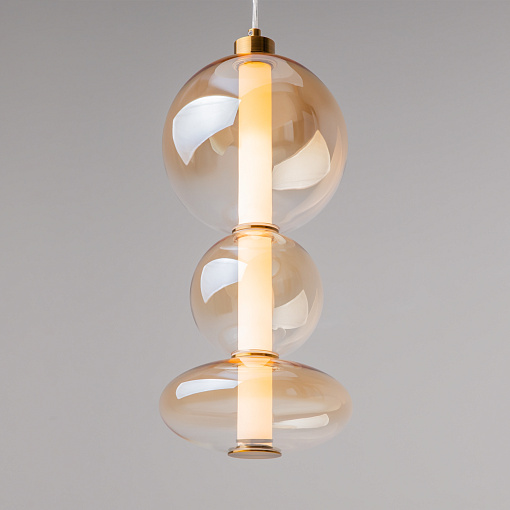 Светильники с тонированными выдувными стеклянными плафонами (дымчатыми  или янтарными) и металлической арматурой (черной или цвета латуни). Окрашивание плафонов градиентное. Источник света: LED. Световой элемент установлен внутри акрилового рассеивателя. Цветовая температура источника света – 3000К, угол рассеивания — 120°. Торшеры снабжены Push-кнопкой на проводе.
