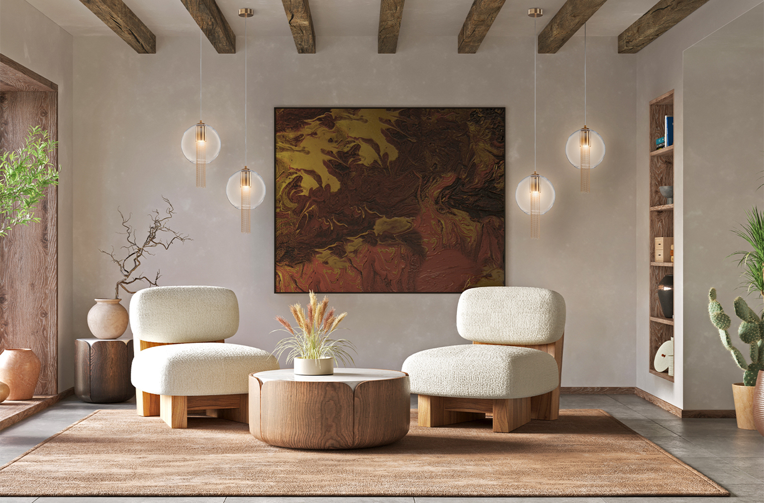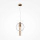 Металлическая арматура в бронзовом оттенке. Плафон-сфера – прозрачное выдувное стекло. Декор – подвесные цепочки внутри плафона. Скрытый источник света.