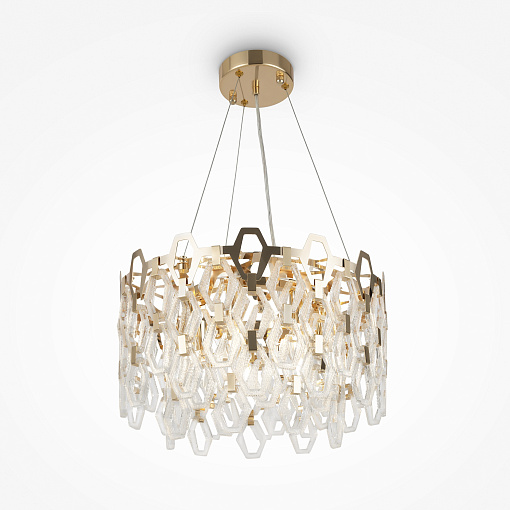 Арматура – металл, цвет – золото. Декоративные подвески – фактурное стекло и металлические пластины. Трендовые геометричные формы. Эффектная игра света в декоре. Широкий ассортимент для общего и зонального освещения.